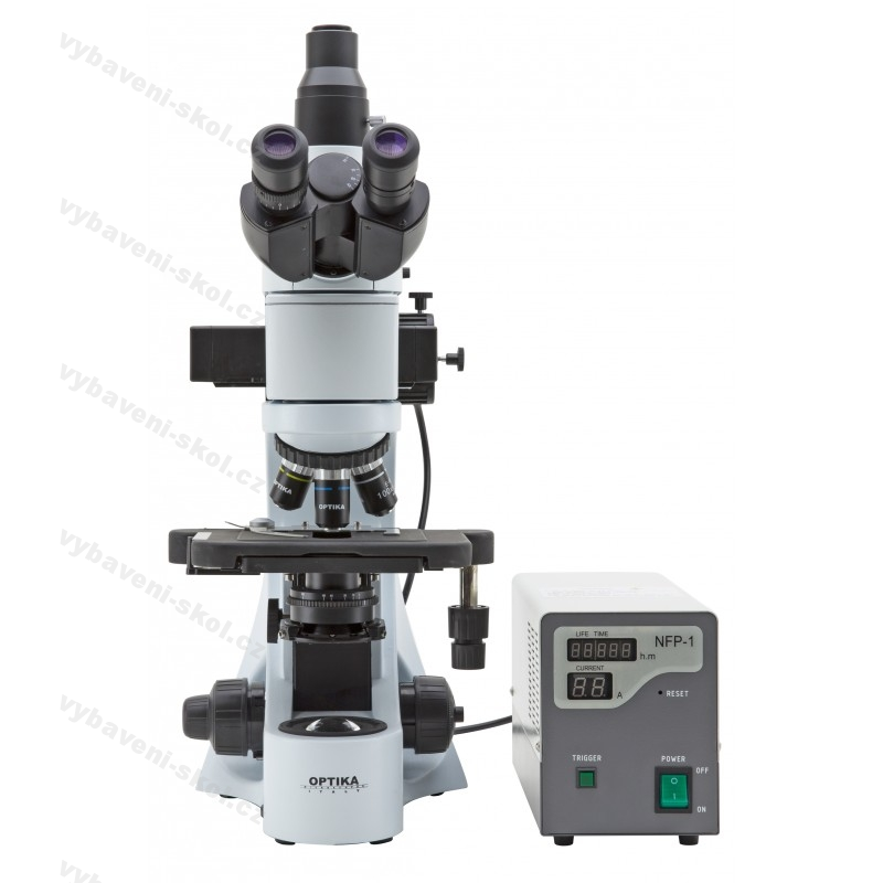 Stabilní ergonomický pevný litinový stativ. Procházející X-LED osvětlení a fluorescenční dopadající osvětlení (rtuťová výbojka).