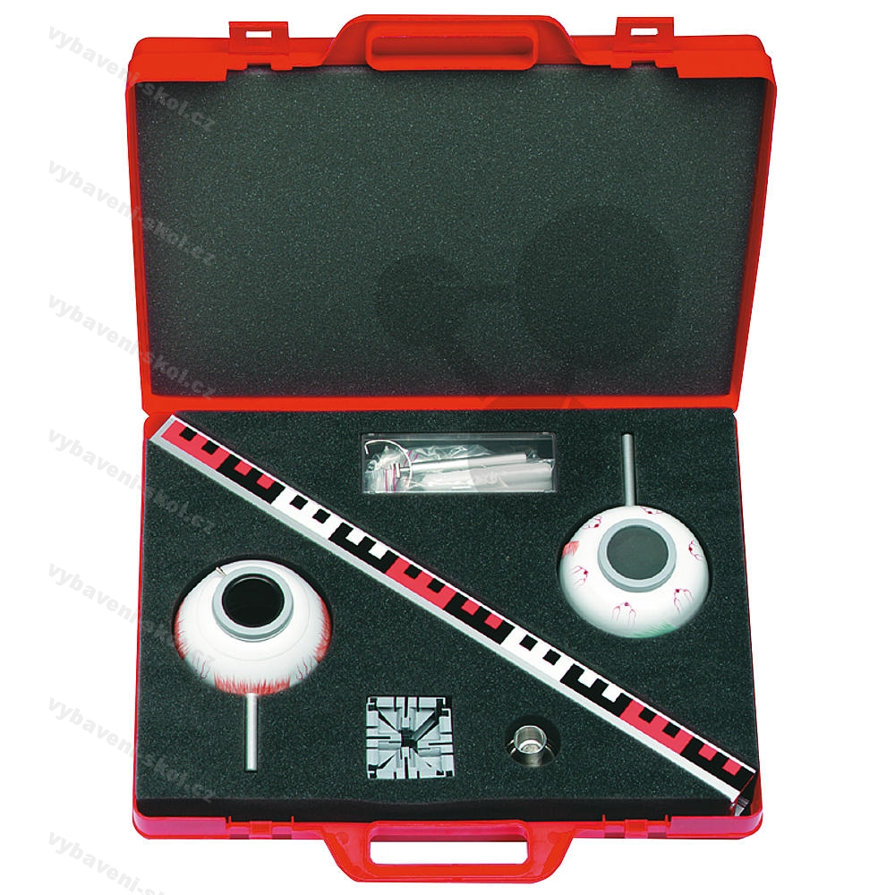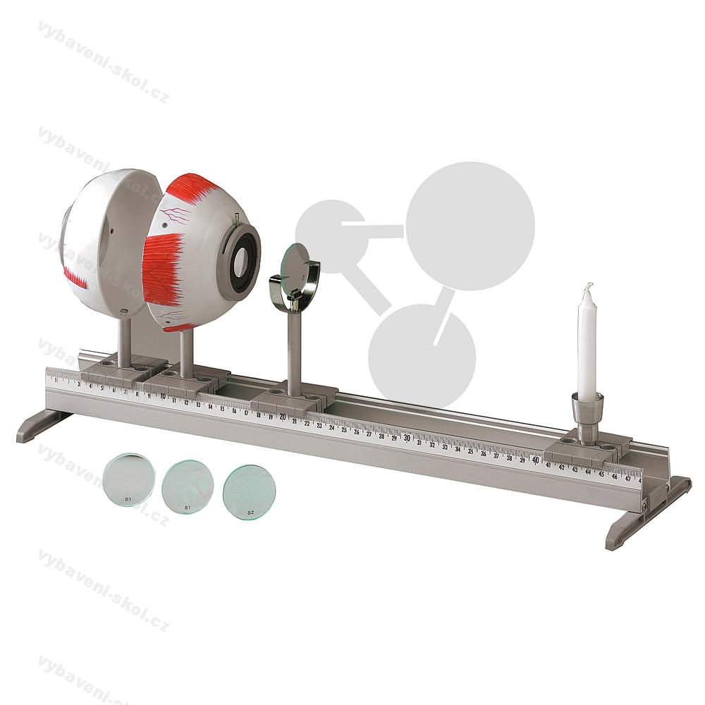 Model slouží k demonstraci optických funkcí oka, jako je zobrazení předmětu na sítnici, akomodace oka (změna zakřivení čočky), krátkozrakosti a dalekozrakosti. Model se skládá z očního pouzdra a nastavitelné irisové clony, držáku na čočky a ze 2 konvexních čoček (f = 65 a 80 mm), očního pouzdra se sítnicí (transparentní clona), korekční konkávní a konvexní čočky, držáku na čočky a návodu k provádění pokusů.