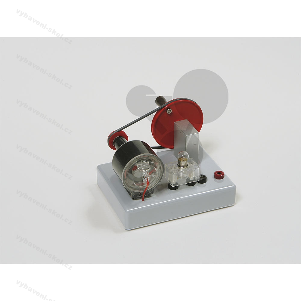 Dynamo s transparentní uzavírací krytkou. Jsou tak viditelné magnetická kotva a cívka. Namontováno na podstavci s řemenovým pohonem a vždy dvěmi 4 mm připojovacími zdířkami jako vývody střídavého a stejnosměrného napětí.