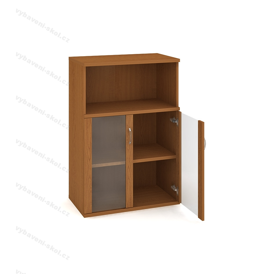 Skříň policová dvéřová S 3 80 05. Rozměr: 80x115x40 cm (ŠxVxH). Prosklená dvířka jsou umístěna ve spodní části skříně s jednou policí. Horní prostor je volný.