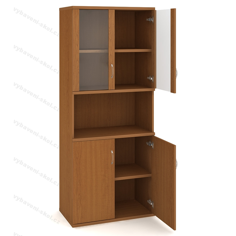 Skříň je opatřena dvěma dvířky. Horní dvířka - skleněná s jednou policí, spodní dvířka - dřevěná také s jednou policí, střední prostor je otevřený.