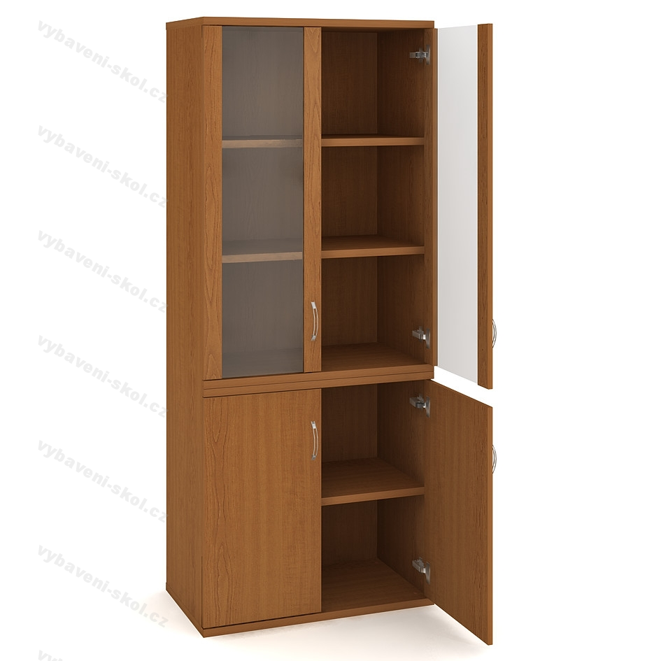 Skříň je opatřena dvěma dvířky. Horní dvířka prosklená se dvěma policemi, spodní dvířka dřevěná s jednou policí.