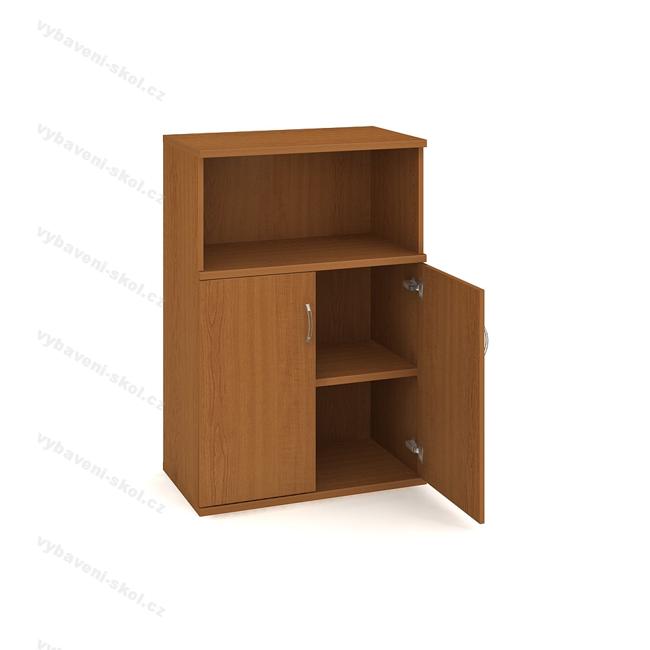Skříň policová dvoudvéřová S 3 80 02. Rozměr: 80x115x40 cm (ŠxVxH). Dvířka jsou umístěna ve spodní části skříně s jednou policí. Horní prostor je volný.