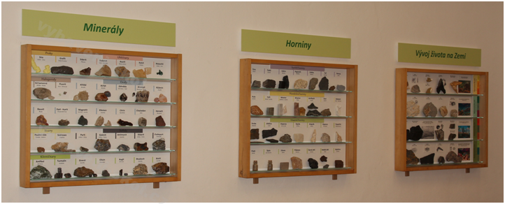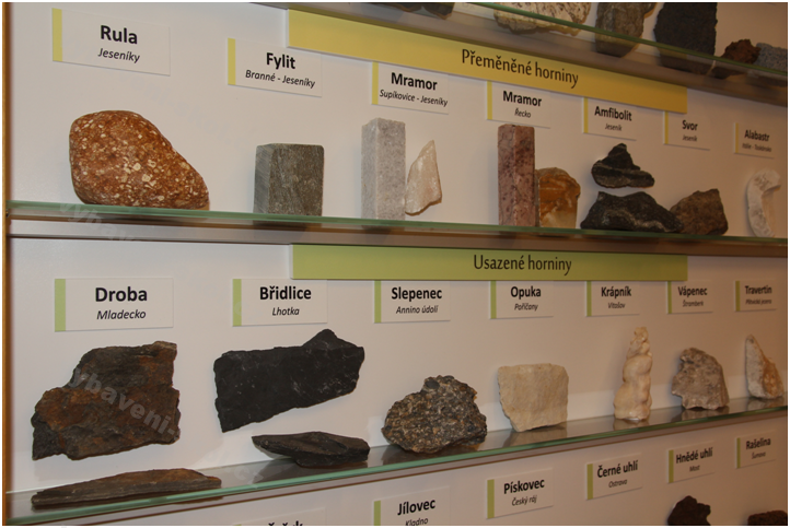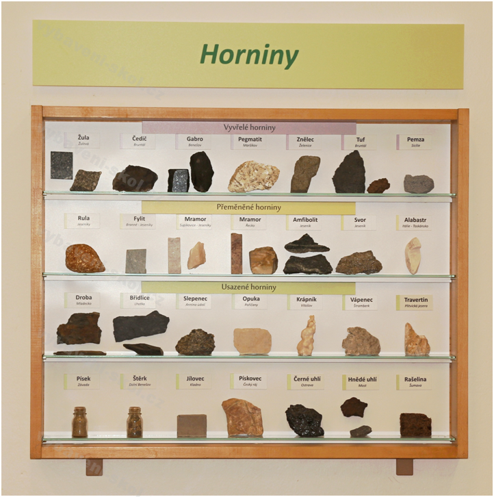 Nástěnná vitrina představující typické zástupce hornin z našeho území i ze světa. Vyvřelé, usazené a přeměněné. 28 kusů.