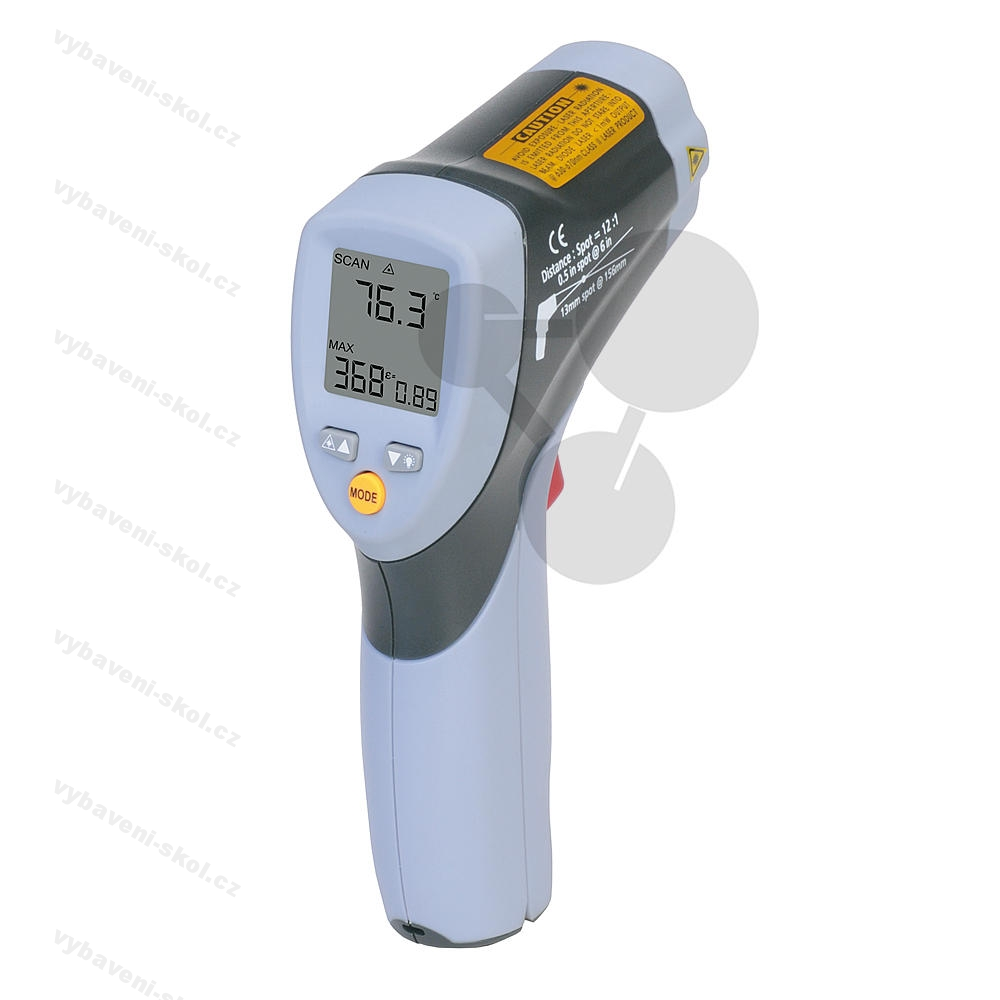 Technické údaje: 2 rozsahy měření: -50°C až +20°C a +20°C až +550 °C (zobrazení lze přepínat z °C na °F). Doba odezvy: cca 150 ms. Rozlišení: 0,1°C/F, poměr vzdálenosti/měřicího bodu: 12:1, napájení: 9V baterie.