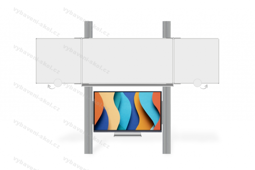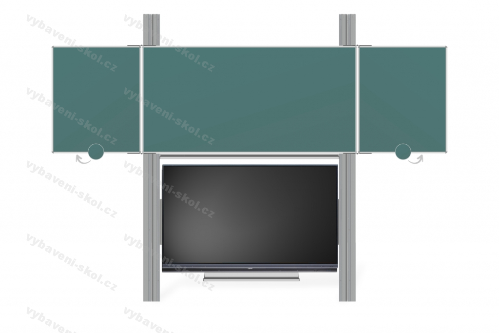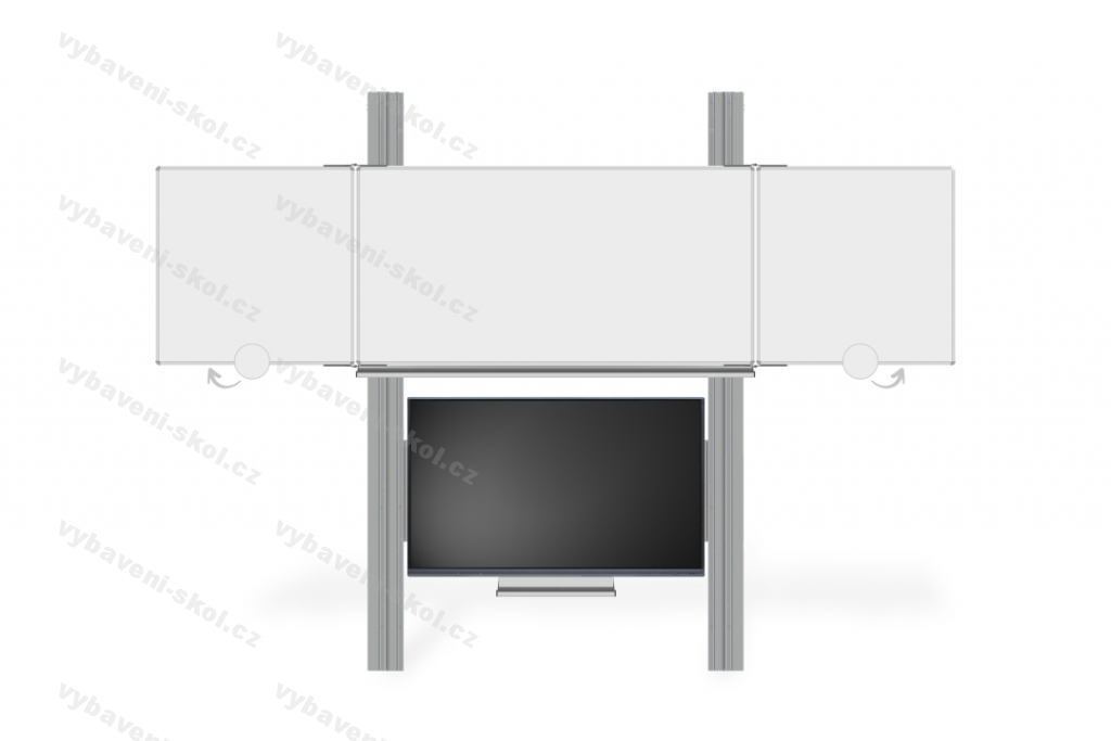 Elegantní moderní pylonové sloupy ze stříbrného eloxovaného hliníku v sadě s přední tabulí TRIPTYCH K o rozměrech 200x100 cm, 240x100 cm nebo 240x120 cm a LCD panel značky AVTEK nebo OPTOMA s uhlopříčkou 65", 75" nebo 86"