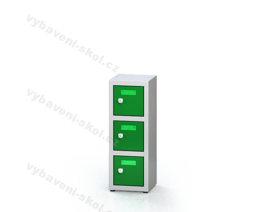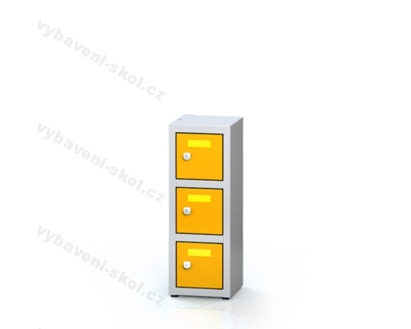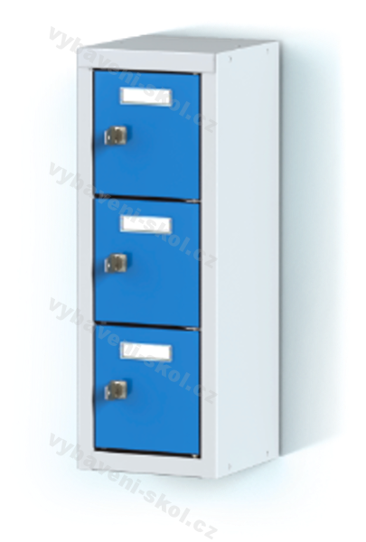 Skříňka (minibox) jednodílná s třemi uzamykatelnými schránkami na soklu 25 mm. Rozměr: 56,7x20x20 cm (VxHxŠ), výška oddělení 15,2 cm.