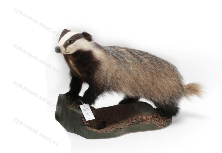 Reálný dermoplastický preparát jezevce lesního v reálné pozici.