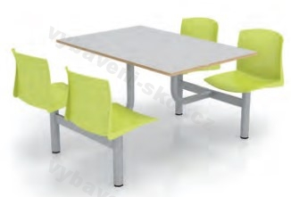 Jídelní sety se vyrábí v pevném provedení. Deska jídelního setu je v provedení HPL laminát, barevné provedení dle vzorníku. Kostra setu se standardně vyrábí ve stříbrné RAL 9006 a je vybavena rektifikačními šrouby, které pomáhají eliminovat nerovnosti podlahy. Sedáky jídelního setu je možné volit z barevných plastových skořepin.