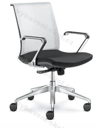 Kancelářská otočná židle, opěrák čalouněný samonosnou síťovinou dle výběru, plastové části černé, houpací mechanismus, leštěný hliníkový kříž, kolečka.