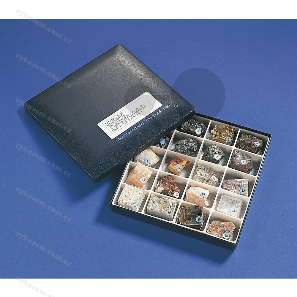 Levná názorná kolekce 20 minerálů nejčastěji obsažených v zemské kůře. Obsahuje typické zástupce v přírodě se nejčastěji vyskytujících prvků, sulfidů, oxidů, halogenidů, uhličitanů, sulfátů a křemičitanů.