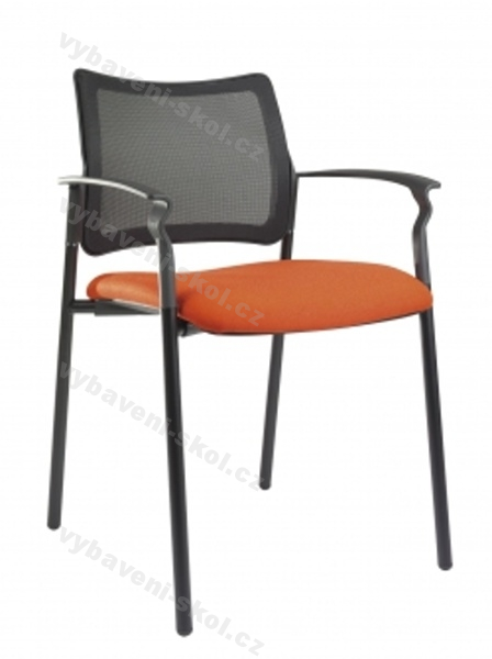 Moderní jednací židle včetně područek (možnost doplnění područek sklopným stolkem), černá síť na opěráku a čaloun dle nabídky na sedáků, ocelový rám chromovaný, lakovaný černě nebo šedě, stohovatelnost 5 kusů, nosnost 120 kg, záruka 36 měsíců.