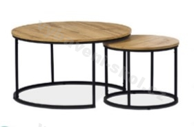 Konferenční set 2 ks stolků. Desky stolků z MDF v dekoru divoký dub. Průměr 80 a 50 cm. Podnože kovové z jäklového profilu v černé barvě.