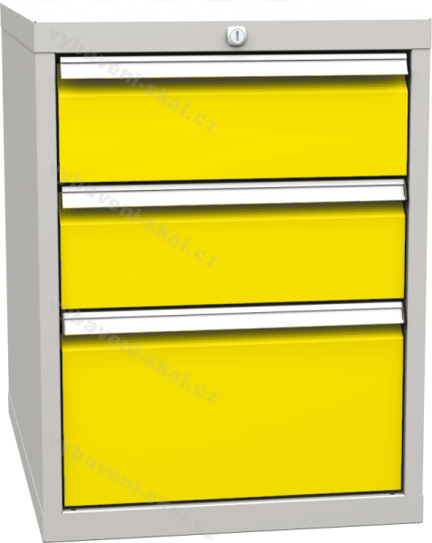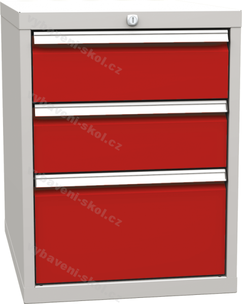 Účelný úložný prostor ve svařovaném pracovním stole představuje zásuvkový kontejner. Je vyroben z ocelového plechu o síle 1 mm šedé barvy RAL, max. nosnost korpusu je 300 kg. Vnitřní prostor vyplňují 2 užší a 1 širší zásuvka s možností výběru barvy RAL s nosností až 80 kg, položené na pevných 75% ložiskových výstupech. V zásuvkách jsou otvory pro plechové dělící prvky, které si můžete zvolit jako doplněk kontejneru a systém blokace proti vysunutí více zásuvek najednou, lze přidat i dělící výplně. Kontejner je centrálně uzamykatelný.