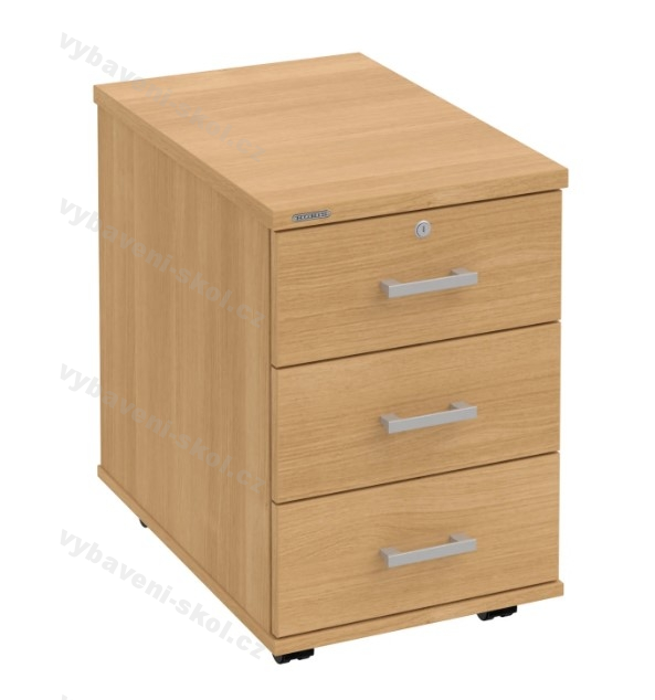 Základním materiálem korpusu kontejneru K 33 N, léta napříč, umístěný na kolečkách, je kvalitní laminovaná dřevotřísková deska o tloušťce 18 mm. Kontejner se skládá ze tří zásuvek. Aby byla zajištěna dlouhodobá životnost, byla použita pro horní díl korpusu deska, jejíž tloušťka je 25 mm. Kvalitní ochranou proti poškození je také 2 mm ABS hrana na horním i spodním dílu korpusu. Usazením kontejneru na sokl 39x20x52,5 cm (ŠxVxH) docílíte dorovnání výšky kontejneru na úroveň stolu a tím zvětšíte pracovní plochu stolové sestavy. Zásuvky jsou z plastu, který je snadno omyvatelný a vhodný pro jednoduchou údržbu. Čela zásuvek jsou vytvořena z kvalitní dřevotřískové desky o tloušťce 18 mm a jsou také vybavena odolnou 2 mm ABS hranou, která garantuje dostatečnou ochranu proti mechanickému i dynamickému poškození. Tento model je BEZ systému STOP-CONTROL. Uzamykatelná pouze horní zásuvka.