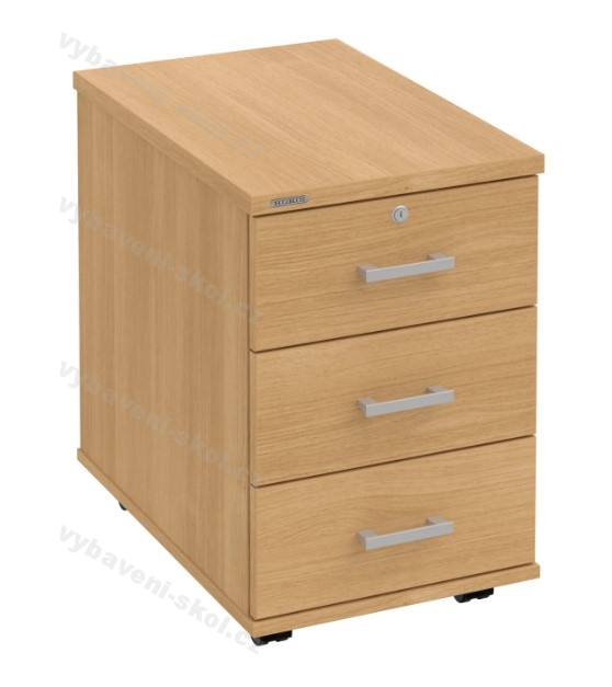 Základním materiálem korpusu kontejneru K 33 P, léta podél, umístěný na kolečkách, je kvalitní laminovaná dřevotřísková deska o tloušťce 18 mm. Kontejner se skládá ze tří zásuvek. Aby byla zajištěna dlouhodobá životnost, byla použita pro horní díl korpusu deska, jejíž tloušťka je 25 mm. Kvalitní ochranou proti poškození je také 2 mm ABS hrana na horním i spodním dílu korpusu. Usazením kontejneru na sokl 39x20x52,5 cm (ŠxVxH) docílíte dorovnání výšky kontejneru na úroveň stolu a tím zvětšíte pracovní plochu stolové sestavy. Zásuvky jsou z plastu, který je snadno omyvatelný a vhodný pro jednoduchou údržbu. Čela zásuvek jsou vytvořena z kvalitní dřevotřískové desky o tloušťce 18 mm a jsou také vybavena odolnou 2 mm ABS hranou, která garantuje dostatečnou ochranu proti mechanickému i dynamickému poškození. Tento model je BEZ systému STOP-CONTROL. Uzamykatelná pouze horní zásuvka.