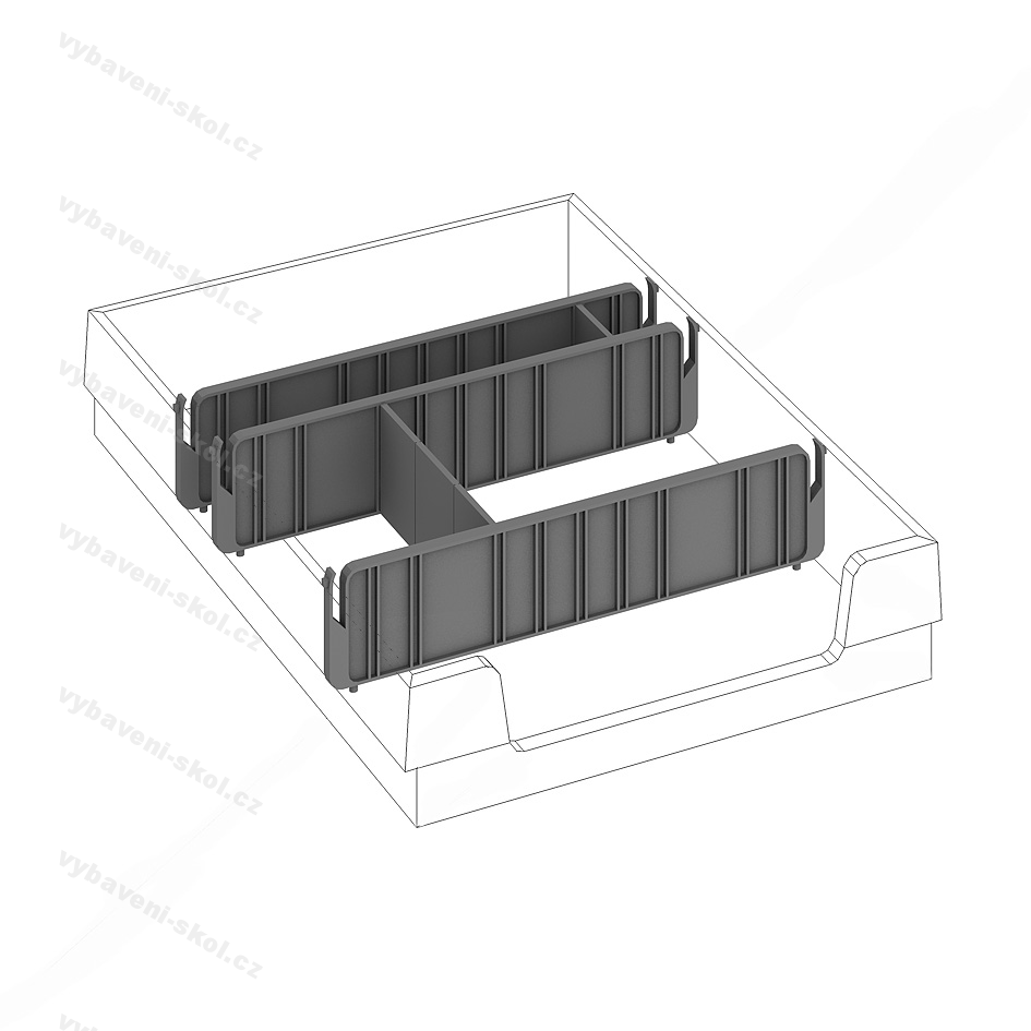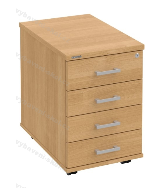 Základním materiálem korpusu kontejneru K 34 C N umístěného na kolečkách, je kvalitní laminovaná dřevotřísková deska o tloušťce 18 mm. Kontejner se skládá ze čtyř zásuvek. Aby byla zajištěna dlouhodobá životnost, byla použita pro horní díl korpusu deska, jejíž tloušťka je 25 mm. Kvalitní ochranou proti poškození je také 2 mm ABS hrana na horním i spodním dílu korpusu. Vysoké nároky na zajištění bezpečnosti obsahu kontejneru zajišťuje osazení kontejneru zámkem s centrálním zamykáním. Postačí zamknout jednu zásuvku a současně se uzamknou i všechny ostatní. Usazením kontejneru na sokl 39x20x52,5 cm (ŠxVxH) docílíte dorovnání výšky kontejneru na úroveň stolu a tím zvětšíte pracovní plochu stolové sestavy. Zásuvky jsou z plastu, který je snadno omyvatelný a vhodný pro jednoduchou údržbu. Čela zásuvek jsou vytvořena z kvalitní dřevotřískové desky o tloušťce 18 mm a jsou také vybavena odolnou 2 mm ABS hranou, která garantuje dostatečnou ochranu proti mechanickému i dynamickému poškození. Praktickou součástí vrchní zásuvky je přehledný organizér a prostorové dělící příčky. Vaše tužky, sponky a další kancelářské potřeby budou vždy srovnané. Díky integrovanému systému STOP-CONTROL v uzamykacím mechanismu se nemusíte bát převrhnutí kontejneru nebo případného skřípnutí rukou. Systém zaručí, že při otevření jedné zásuvky se ostatní zásuvky automaticky zablokují.