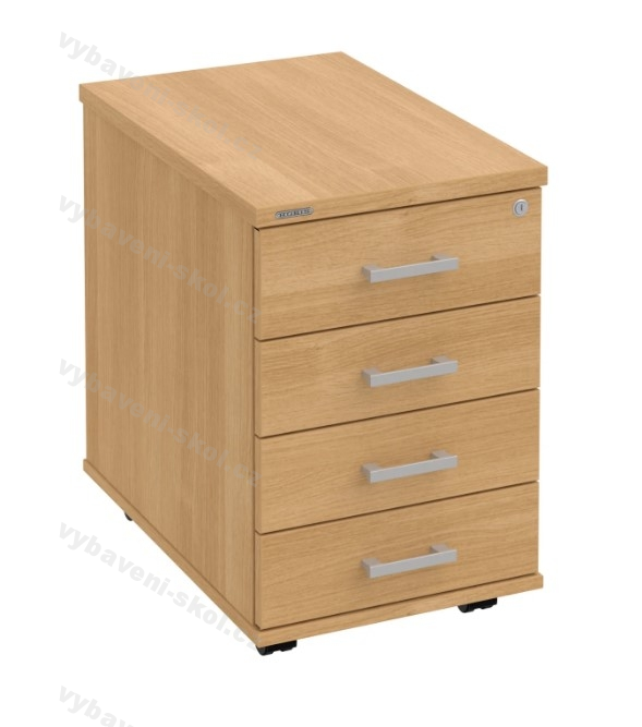 Základním materiálem korpusu kontejneru K 34 C P umístěného na kolečkách, je kvalitní laminovaná dřevotřísková deska o tloušťce 18 mm. Kontejner se skládá ze čtyř zásuvek. Aby byla zajištěna dlouhodobá životnost, byla použita pro horní díl korpusu deska, jejíž tloušťka je 25 mm. Kvalitní ochranou proti poškození je také 2 mm ABS hrana na horním i spodním dílu korpusu. Vysoké nároky na zajištění bezpečnosti obsahu kontejneru zajišťuje osazení kontejneru zámkem s centrálním zamykáním. Postačí zamknout jednu zásuvku a současně se uzamknou i všechny ostatní. Usazením kontejneru na sokl 39x20x52,5 cm (ŠxVxH) docílíte dorovnání výšky kontejneru na úroveň stolu a tím zvětšíte pracovní plochu stolové sestavy. Zásuvky jsou z plastu, který je snadno omyvatelný a vhodný pro jednoduchou údržbu. Čela zásuvek jsou vytvořena z kvalitní dřevotřískové desky o tloušťce 18 mm a jsou také vybavena odolnou 2 mm ABS hranou, která garantuje dostatečnou ochranu proti mechanickému i dynamickému poškození. Praktickou součástí vrchní zásuvky je přehledný organizér a prostorové dělící příčky. Vaše tužky, sponky a další kancelářské potřeby budou vždy srovnané. Díky integrovanému systému STOP-CONTROL v uzamykacím mechanismu se nemusíte bát převrhnutí kontejneru nebo případného skřípnutí rukou. Systém zaručí, že při otevření jedné zásuvky se ostatní zásuvky automaticky zablokují.