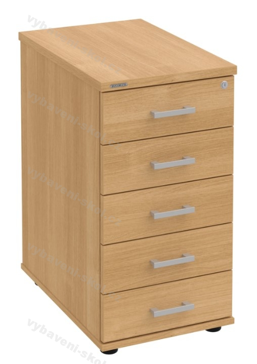 Základním materiálem korpusu kontejneru K 35 C P umístěného na kolečkách, je kvalitní laminovaná dřevotřísková deska o tloušťce 18 mm. Kontejner se skládá z pěti zásuvek. Aby byla zajištěna dlouhodobá životnost, byla použita pro horní díl korpusu deska, jejíž tloušťka je 25 mm. Kvalitní ochranou proti poškození je také 2 mm ABS hrana na horním i spodním dílu korpusu. Vysoké nároky na zajištění bezpečnosti obsahu kontejneru zajišťuje osazení kontejneru zámkem s centrálním zamykáním. Postačí zamknout jednu zásuvku a současně se uzamknou i všechny ostatní. Zásuvky jsou z plastu, který je snadno omyvatelný a vhodný pro jednoduchou údržbu. Čela zásuvek jsou vytvořena z kvalitní dřevotřískové desky o tloušťce 18 mm a jsou také vybavena odolnou 2 mm ABS hranou, která garantuje dostatečnou ochranu proti mechanickému i dynamickému poškození. Praktickou součástí vrchní zásuvky je přehledný organizér a prostorové dělící příčky. Vaše tužky, sponky a další kancelářské potřeby budou vždy srovnané. Díky integrovanému systému STOP-CONTROL v uzamykacím mechanismu se nemusíte bát převrhnutí kontejneru nebo případného skřípnutí rukou. Systém zaručí, že při otevření jedné zásuvky se ostatní zásuvky automaticky zablokují.