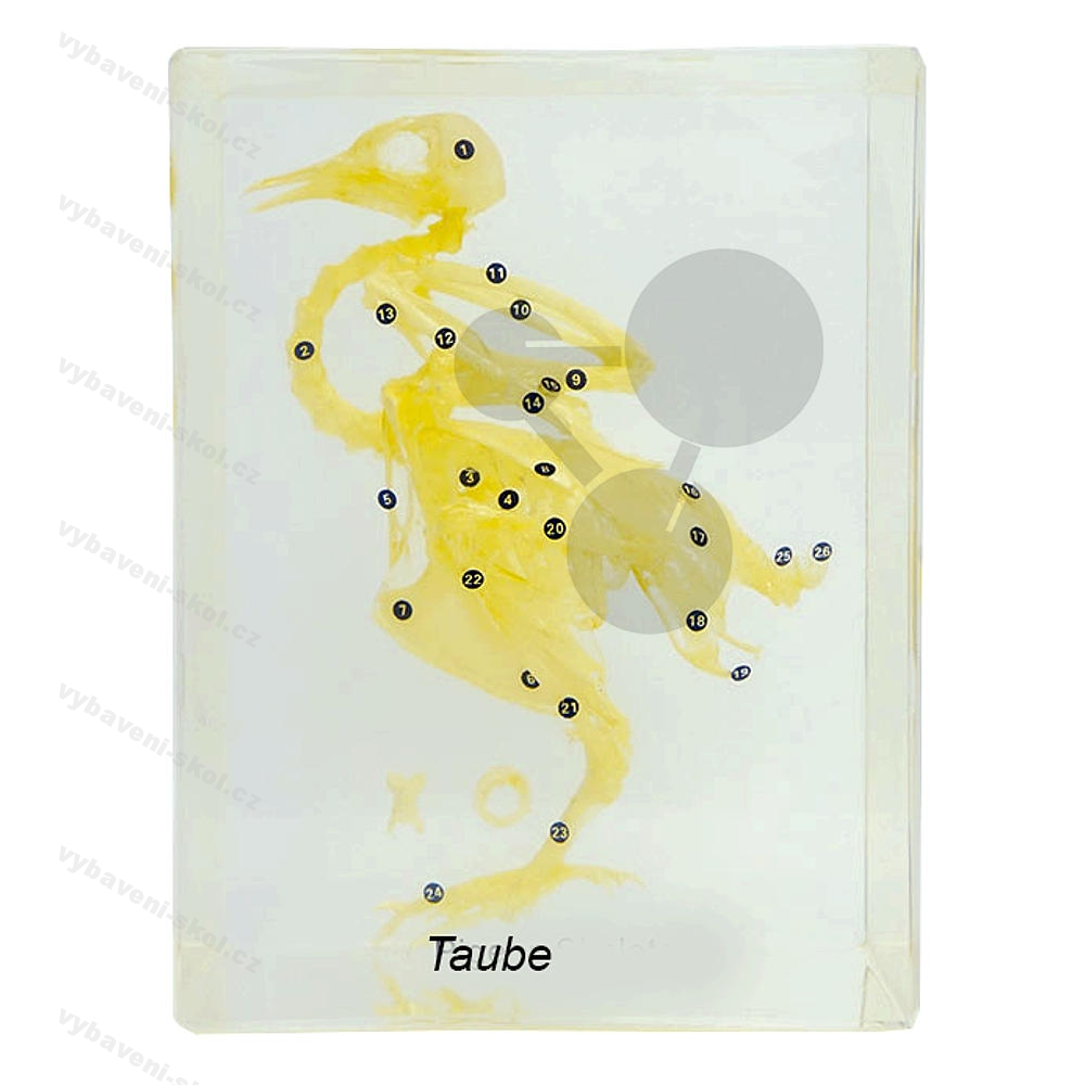 Kostra skutečného holuba, zalitá v pryskyřici.
