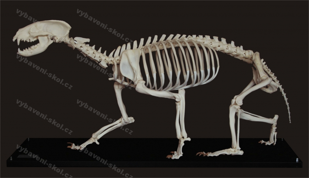 Kostěný preparát na dřevěném podstavci se skleněným krytem a popiskem. Jedná se o seskládané reálné kosti zvířete spojené drátky a lepidlem. Materiál je získáván jako úhyny z veterinárních ordinací nebo z chovů a je zpracováván dle pravidel veterinárního zákona a hygieny v dílně s registrací státní veterinární správy. Obsahuje všechny kosti zvířete kromě hrudní kosti a chrupavek. Kosti jsou důkladně odmaštěny, očištěny a vyběleny. Preparát tedy neobsahuje žádné zbytky tkání a všechny kosti a kloubní spojení jsou jasně zřetelné. Jedná se o precizní zpracovaní v dynamickém postavení. Z hlediska kvality, ceny, časové dostupnosti a servisu se jedná o nejlepší produkt na trhu. Anatomická pomůcka je vhodná pro základní, střední a vysoké školy, ale také pro veterinární ordinace.