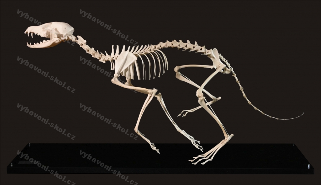 Kostěný preparát na dřevěném podstavci se skleněným krytem a popiskem. Jedná se o seskládané reálné kosti zvířete spojené drátky a lepidlem. Materiál je získáván jako úhyny z veterinárních ordinací nebo z chovů a je zpracováván dle pravidel veterinárního zákona a hygieny v dílně s registrací státní veterinární správy. Obsahuje všechny kosti zvířete kromě hrudní kosti a chrupavek. Kosti jsou důkladně odmaštěny, očištěny a vyběleny. Preparát tedy neobsahuje žádné zbytky tkání a všechny kosti a kloubní spojení jsou jasně zřetelné. Jedná se o precizní zpracovaní v dynamickém postavení. Z hlediska kvality, ceny, časové dostupnosti a servisu se jedná o nejlepší produkt na trhu. Anatomická pomůcka je vhodná pro základní, střední a vysoké školy, ale také pro veterinární ordinace.