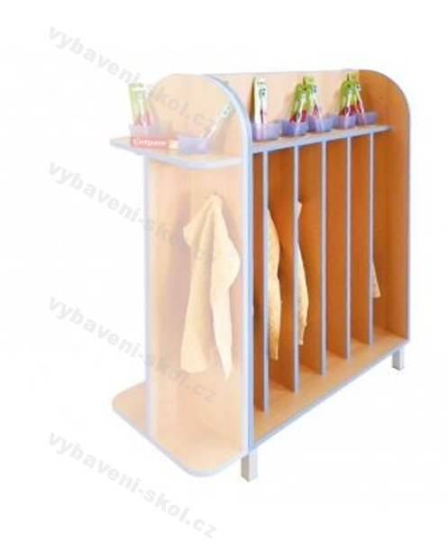 Koupelnová police oboustranná pro dvanáct dětí do Mateřské Školky. Vyhovuje všem hygienickým předpisům. Korpus skříňky je standardně vyráběn ve dvou dezénech (možnost výběru) lamino desek o síle 18 mm a chráněn 0,5 až 2 mm ABS hranou s výběrem barevného provedení. Korpus je včetně nožiček, kovových háčků na ručníky a kelímků. Není nutné kotvit. Nabízíme variantu pro 12 a 14 dětí, také ukončovací díl sestavy (78502004-22, 78502004-24).