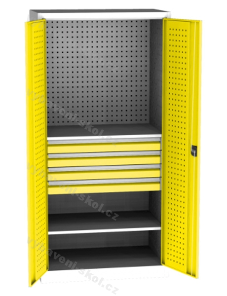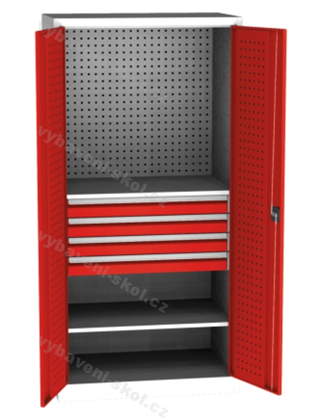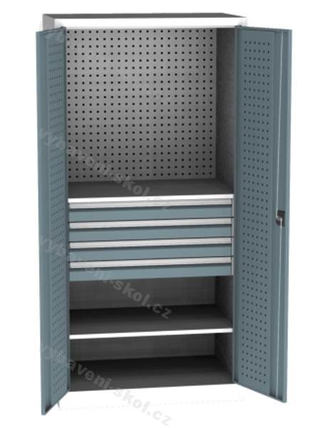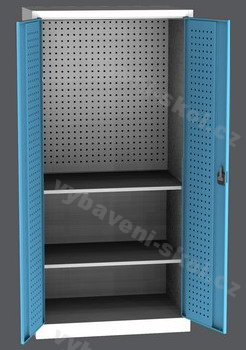 Více možností pro přehledné uložení pracovního nářadí a nástrojů poskytuje tato univerzální dílenská skříň, která je provedena v šedé RAL a dvířka v možných barevných variantách RAL. Perforovanými panely Q-SYSTÉM, které slouží pro uchycení držáků nářadí, jsou vybaveny dvoukřídlé dveře i vnitřní zadní stěna skříně. Masívní konstrukce z kvalitního ocelového plechu o síle 1 mm je doplněna dvěma stavitelnými policemi po 25 mm s nosností 100 kg nebo zásuvkami o nosnosti 50 kg. (Počet polic a zásuvek možno zvolit dle přání zákazníka s širokou možností doplňků na vybavení skříně). Dílenská skříň je zabezpečena cylindrickým zámkem GBS s dvoubodovým rozvorovým mechanismem. Nosnost korpusu je 800 kg. V případě požadavku dovybavení dílenské univerzální skříně nás kontaktujte, budou Vám nabídnuty další doplňky s individuální kalkulací.