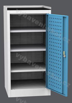 Praktická dílenská skříňka poskytuje úložný prostor na dokumenty, nářadí nebo osobní věci. Ocelový šedý korpus skříňky je v horní části zakončen rámem s 3 mm pryžovou výplní a slouží jako další úložný prostor např. pro drobné předměty. Skříňka je vybavena třemi policemi, výškově stavitelnými po 25 mm, nosnost polic je 20 kg. Vnitřní uspořádání lze měnit a doplňovat dle požadavků zákazníka. Dveře skříňky s volitelnou barvou RAL, jsou z vnitřní strany vybaveny Q-SYSTÉM perforací pro uchycení držáků nářadí a je v nich instalován cylindrický zámek, který má 2000 kombinací, na vyžádání zákazníka se dvěma klíči nebo možností dodání hlavního klíče.