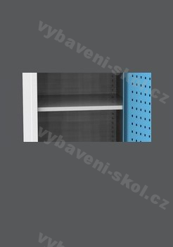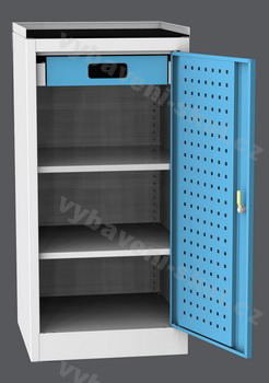 Nízká dílenská skříňka s členěným úložným prostorem na dokumenty, nářadí nebo osobní věci. Ocelový šedý korpus skříňky je v horní části nastaven rámem s 3 mm pryžovou výplní. Skříňka je vybavena policemi a zásuvkou. Vše je výškově stavitelné po 25 mm, nosnost polic a zásuvky 20 kg. Vnitřní uspořádání lze měnit dle požadavků zákazníka. Dvířka skříňky s možností volitelnosti barvy RAL jsou z vnitřní strany vybaveny Q-SYSTÉM perforací pro uchycení držáků nářadí, uzamykají se cylindrickým zámkem se dvěma klíči (možnost dodání hlavního klíče). Celková nosnost korpusu 200 kg.