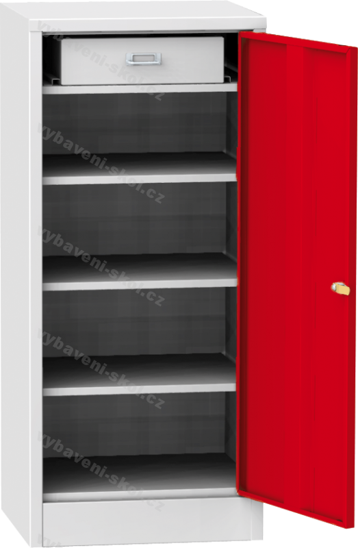 Jednoduchá kovová dílenská skříňka na nářadí pro uložení pracovních věcí. Ve vnitřním prostoru obsahuje 3 pevně usazené police a 1 volně vloženou zásuvku. Dveře skříňky s možností volby barvy RAL jsou opatřeny cylindrickým zámkem se 2 klíči, (možnost dodání hlavního klíče).