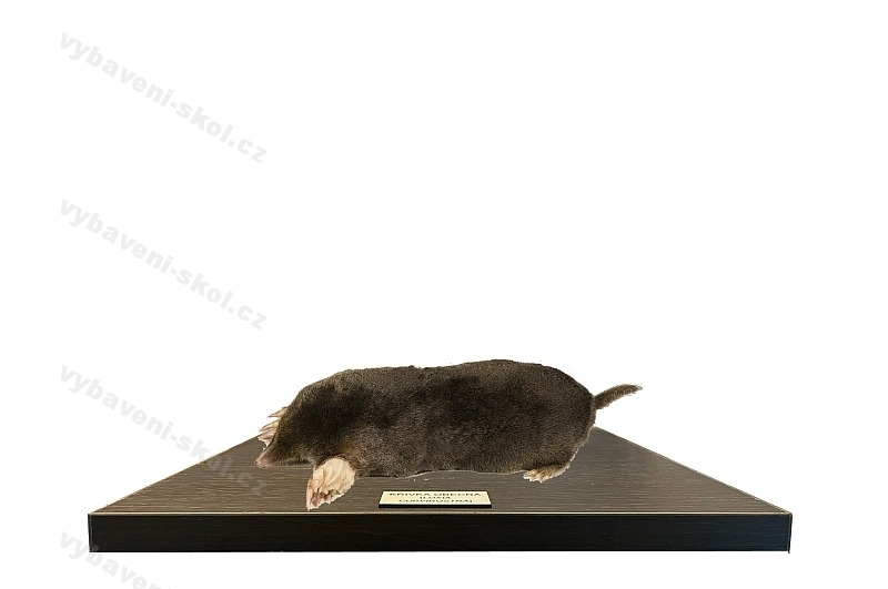Reálný dermoplastický preparát krtka obecného v reálné pozici.
