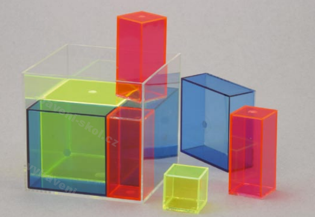 Skládací krychle k demonstraci vzorce (a+b)3. Barevně rozlišeno. Velikost 10 x 10 x 10 cm.