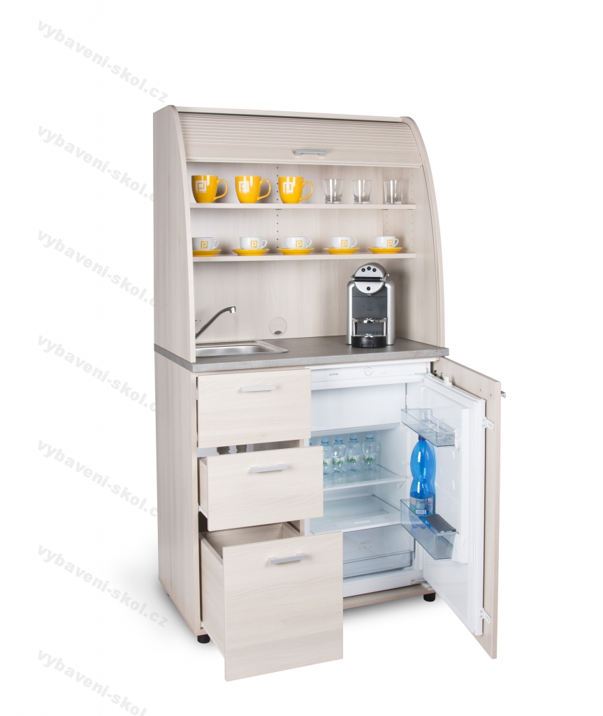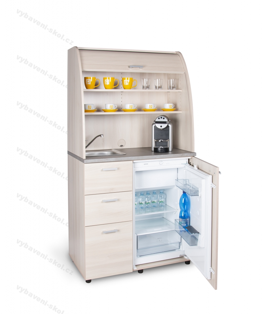 - Vybavení spodní části kuchyňky tvoří chladnička o objemu 99 l a mraznička o objemu 15 l v úsporné energetické třídě A++