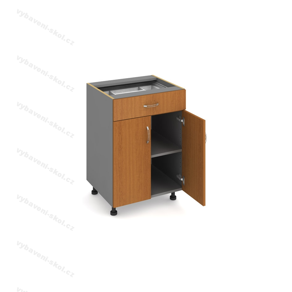 Funkční a moderní kuchyňský nábytek do domácnosti, restaurace a dalších stravovacích zařízení. Univerzální spodní skříňka je vhodná do různých typů kuchyní. Úložný prostor tvoří police krytá dvoukřídlými dveřmi a zásuvka. Korpus skříně a dvířka jsou zhotovené z laminované dřevotřískové desky v tloušťce 18 mm, korpus šedý, barevné varianty dveří v nabídce níže. Záda tvoří bílý sololak tl. 3 mm. Široká kuchyňská skříň je umístěná na nohách s rektifikací pro vyrovnání nerovností podlah. Kvalitní vnitřní kování a další doplňky. Zboží je dodávané v demontovaném stavu. Rozměry 60x72,4(+10)x54cm (Š x V x H).