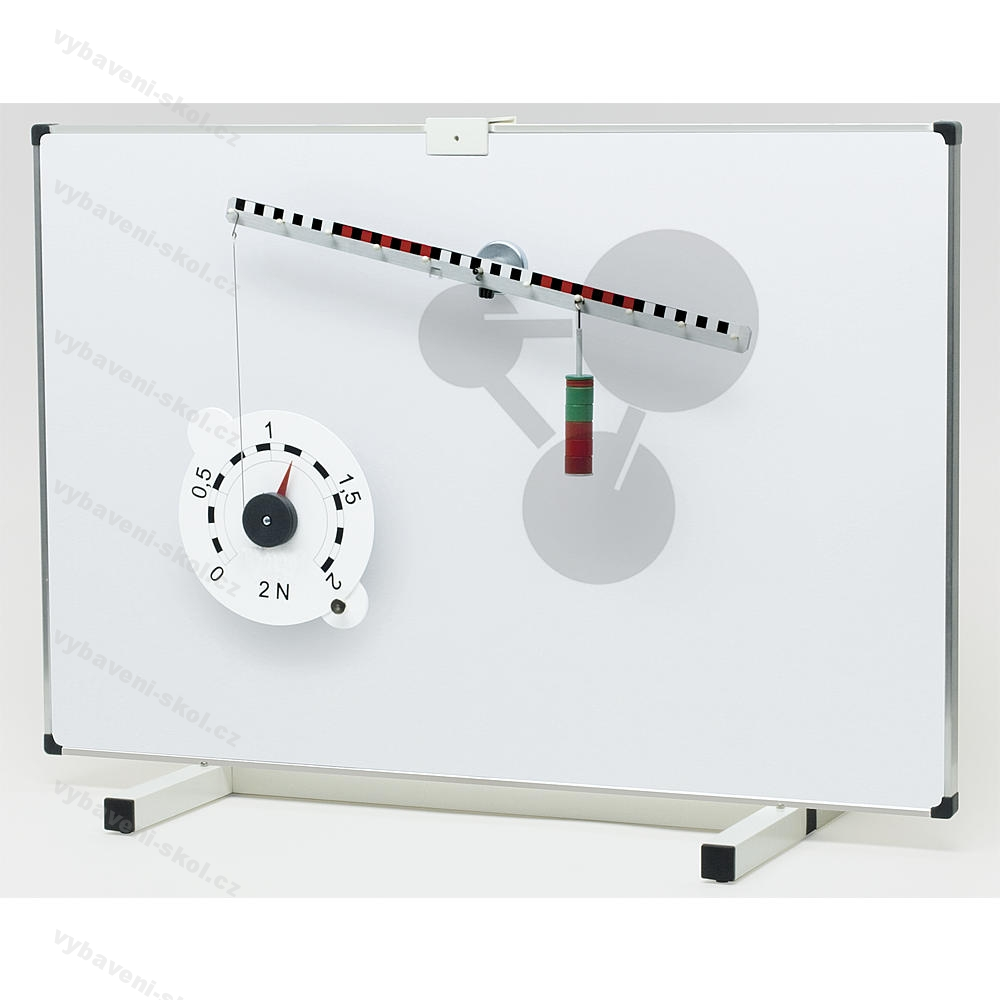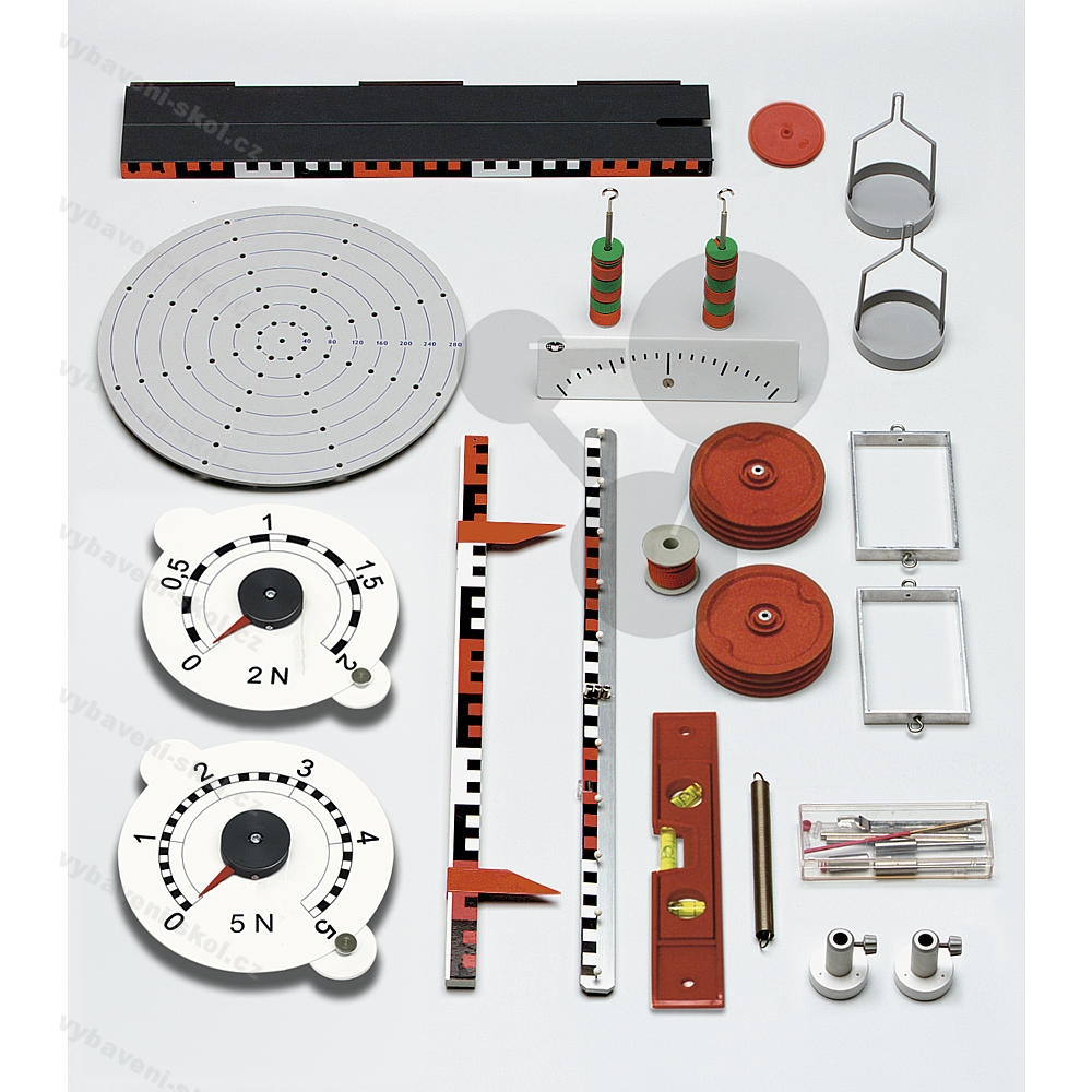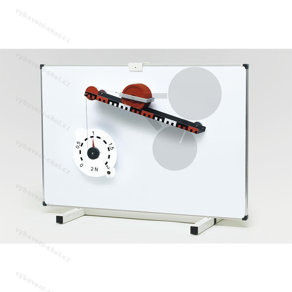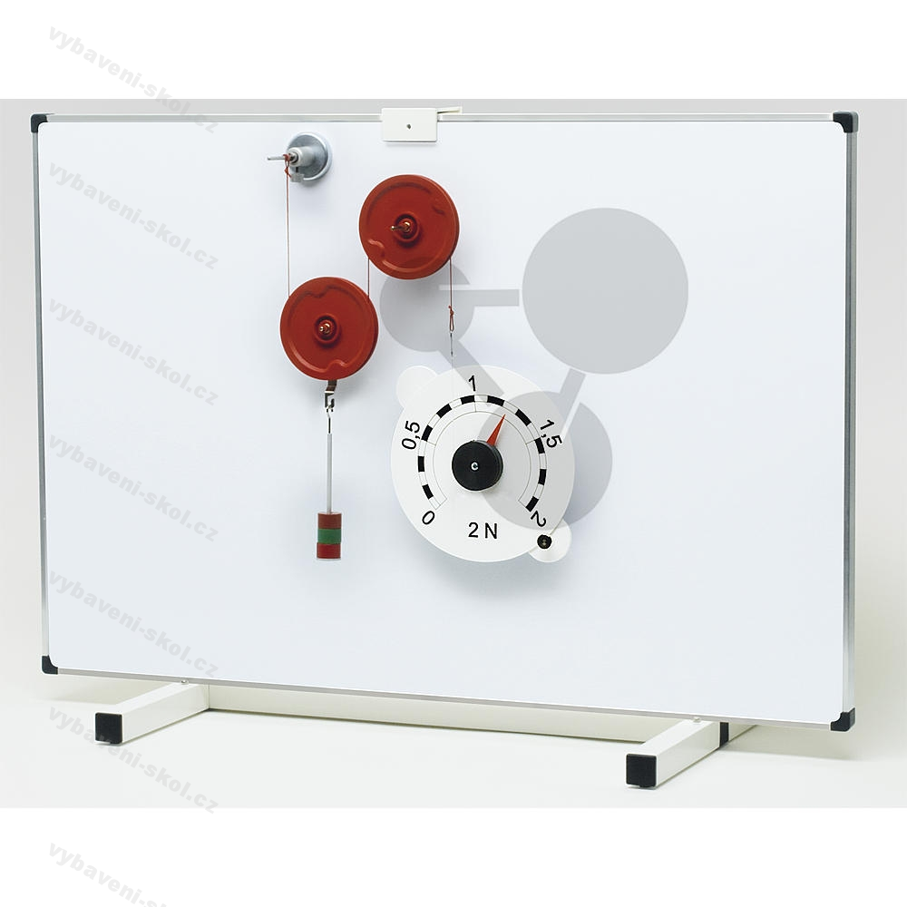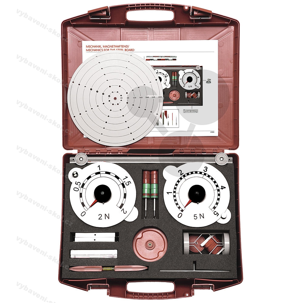 Sada pomůcek pro demonstraci základních zákonů mechaniky tuhých těles a jednoduchých strojů jako kladek, kladkostrojů, pák a nakloněné roviny na jakékoli vhodné ocelové tabuli.