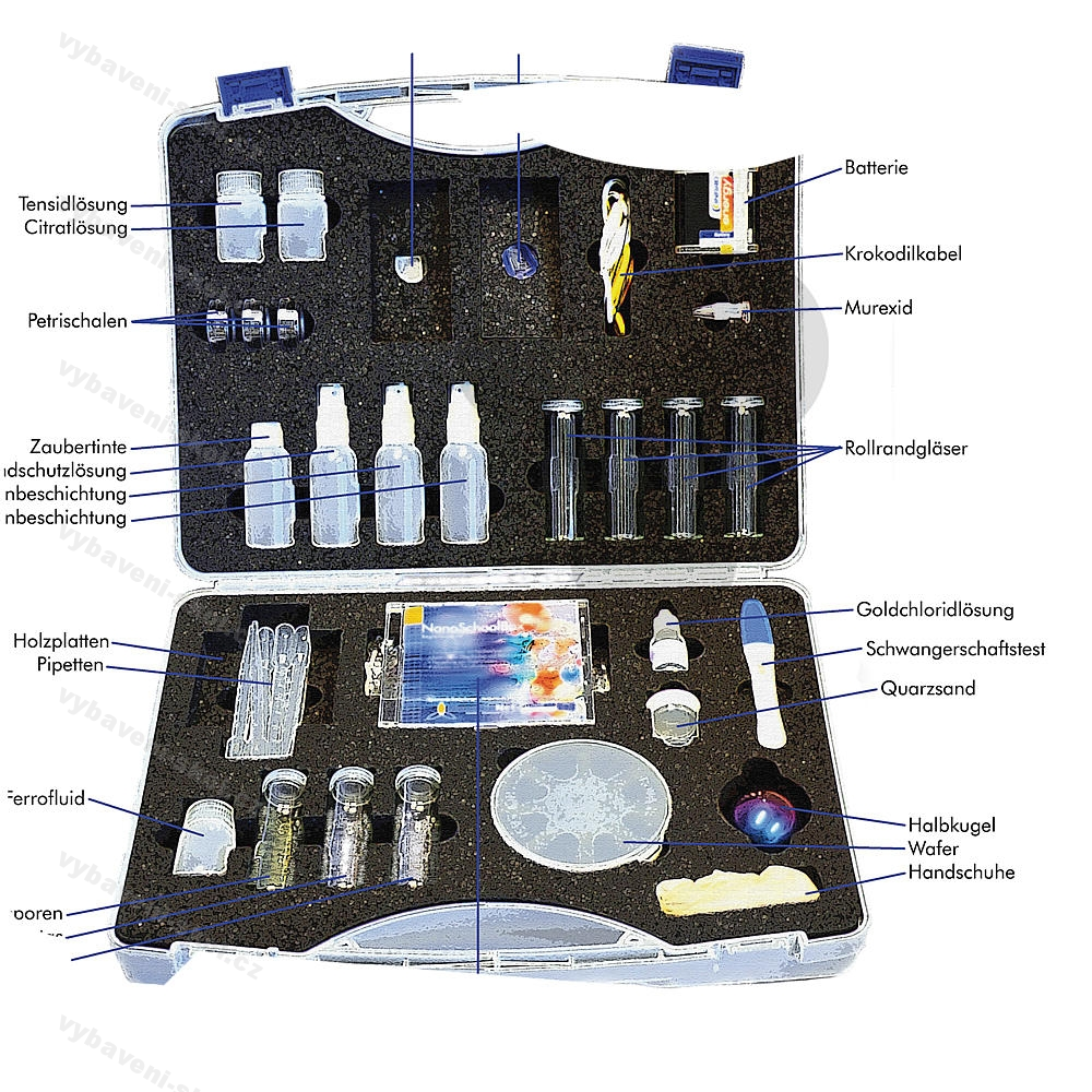 V nanotechnologii postupujeme kupředu v rozměrech hmoty, v nichž látky mění svoje vlastnosti kvůli nepatrné velikosti částic. Protože se tyto změny dějí pravidelně, dají se pozorované jevy technicky využít. Nano se odvozuje od řeckého slova, které znamená trpaslík. Čím více tedy rozumíme tomuto trpasličímu světu, tím úžasnější příležitosti se otevírají pro medicínu, elektroniku a ochranu životního prostředí. V neposlední řadě: Nanotechnologie je dynamickým motorem růstu v četných branžích, v nichž vznikají vzdělávací prostory a pracoviště budoucnosti. Vyzkoušejte si nanotechnologie Kufřík Nanotechnologie obsahuje pomůcky pro 14 pokusů a pět demonstračních předmětů, CD-ROM s průvodním materiálem a bezpečnostními listy a 68stránkovou brožuru s popisy pokusů a podrobnými informacemi. Pokusy může demonstrovat učitel při vyučování fyziky, biologie a chemie, nebo je mohou žáci provádět sami.