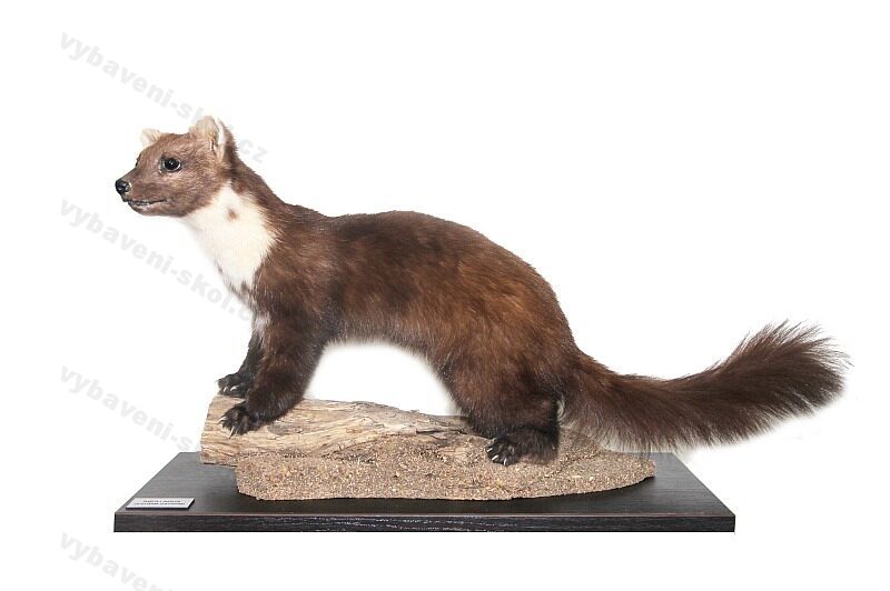 Reálný dermoplastický preparát kuny skalní v reálné pozici.