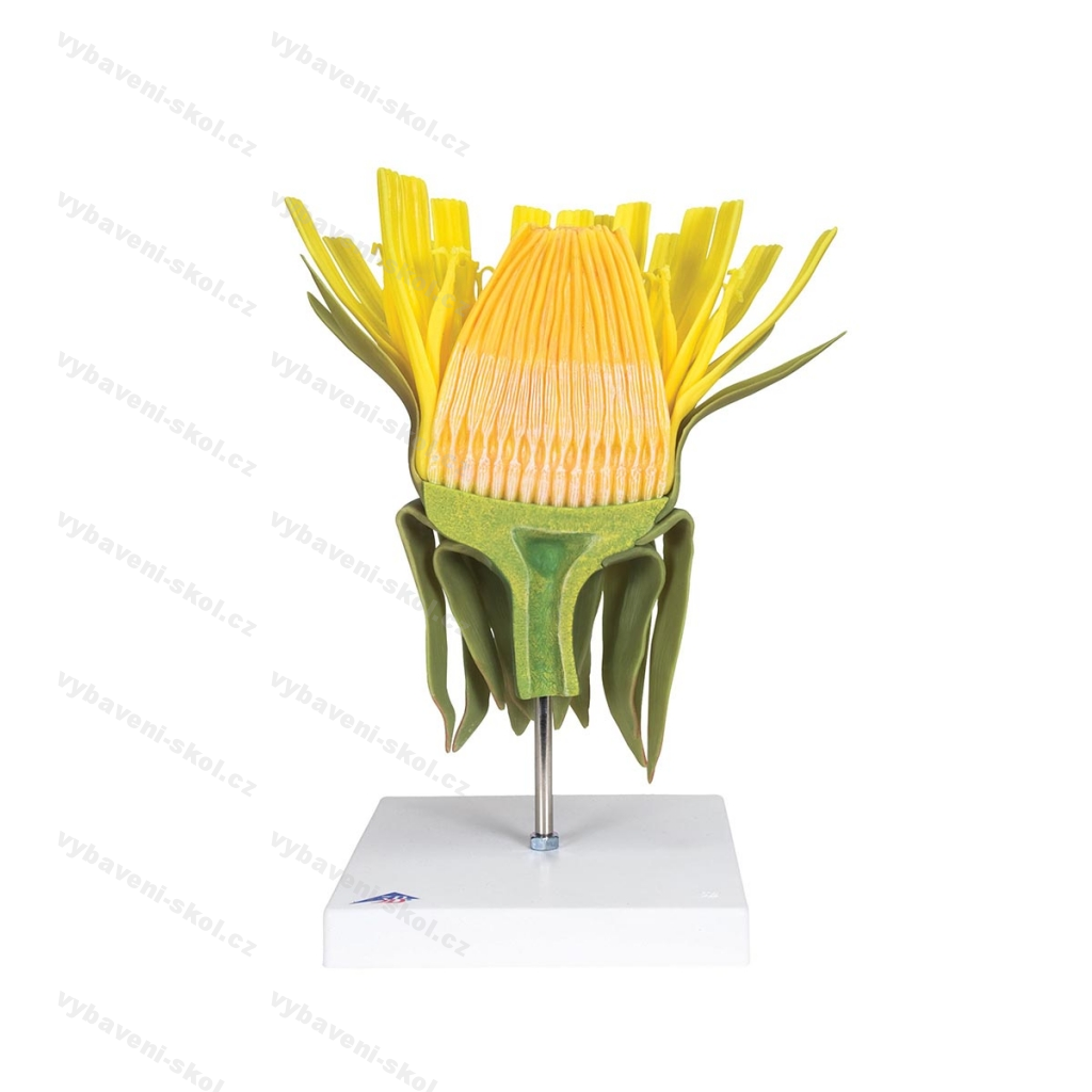 Květ pampelišky. Sada 3 plastovým modelů. Květenství v podélném řezu v 8 násobném zvětšení. Samostatné semínko s létacím orgánem. Samostatný květ.