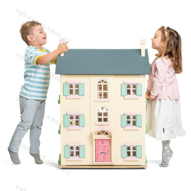 Velký čtyřpatrový ručně malovaný domeček pro panenky vysoký 92 cm. Jednotlivé pokoje jsou odlišně zdobené. Schodiště prolínající se středem domečku zároveň slouží jako předěl mezi jednotlivými pokoji. Domeček má funkční otvírací okna, okenice a dveře. Domeček lze otevřít z jedné strany. Střecha je z poloviny odnímatelná. Domeček nabízí velký prostor pro hraní a rozvíjení kreativity. Domeček je určen pro panenky do 15 cm.