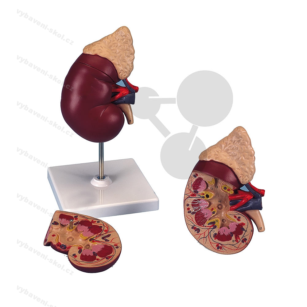 V kvalitě LabGear. Ledvina s nadledvinkou, cévy ledvin a nadledvin, horní segment močovodu, k prohlédnutí dřeně ledviny a ledvinné pánvičky lze přední polovinu ledviny sejmout. 14 x 9 x 5 cm. Pro 2. stupeň ZŠ.