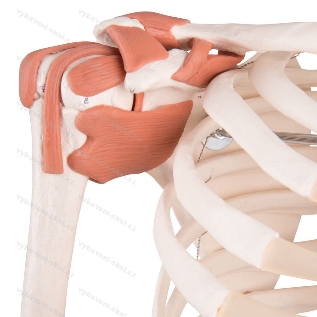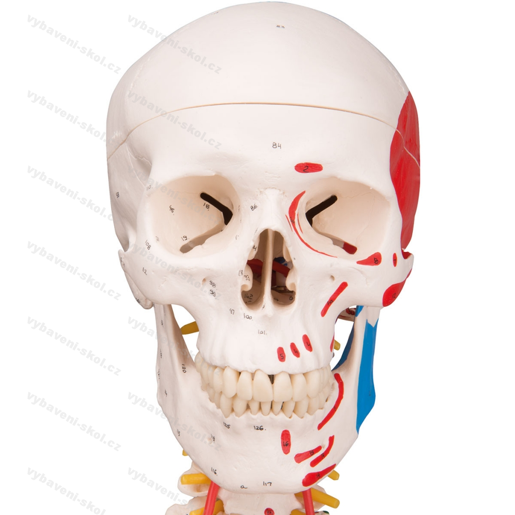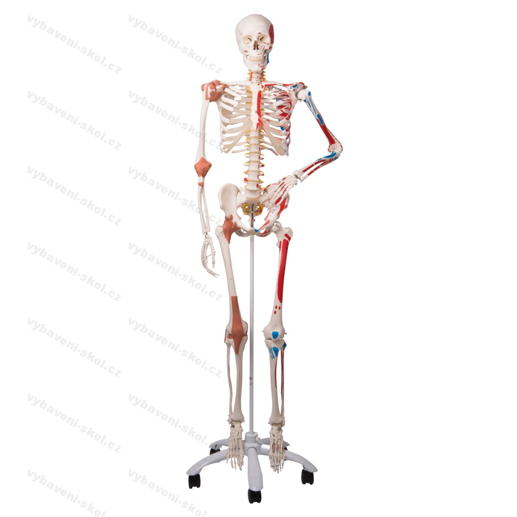 Špičková verze lidské kostry. Vlevo vyznačeny úpony (modře) a počátky svalů (červeně). Vpravo úpony ramenního, loketního, kolenního a kyčelního kloubu. Pohyblivé klouby, flexibilní páteř. Výhřez ploténky mezi 3. a 4. obratlem. Přes 600 číslovaných struktur a detailů. Odnímatelná lebka rozebíratelná na 3 díly. Odnímatelné končetiny. Vyrobeno z nerozbitného trvanlivého plastu. Pojízdný pětiramenný stojan, kolečka s brzdou, transparentní obal proti prachu. Špičková kvalita 3B Scientific. Velikost 176 cm, hmotnost 9,4 kg.