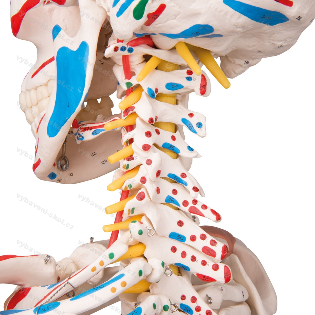 Vyznačeny úpony a počátky svalů. Úpony kloubů. Pohyblivé klouby, flexibilní páteř. Výhřez ploténky. Přes 600 číslovaných struktur a detailů. Odnímatelná rozebíratelná lebka, odnímatelné končetiny. Kvalita 3B Scientific.