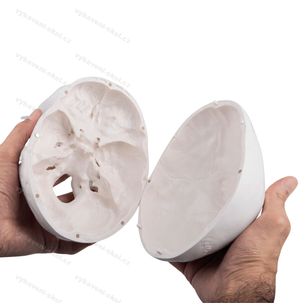 Model lidské lebky s mozkem ve skutečné velikosti. Rozložitelný na lebeční klenbu, spodinu lebeční a dolní čelist. Uvnitř model mozku, levá polovina mozku rozložitelná. Kvalita 3B Scientific.