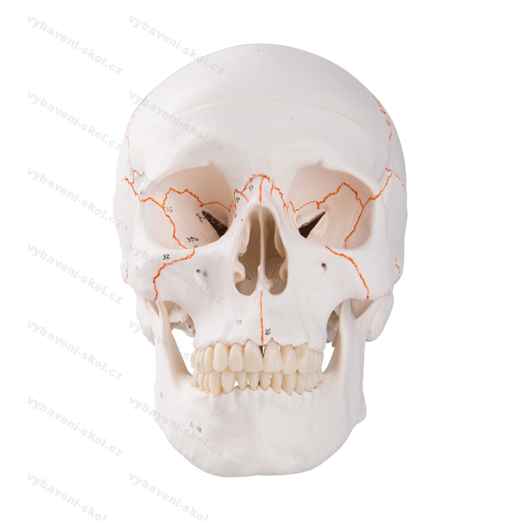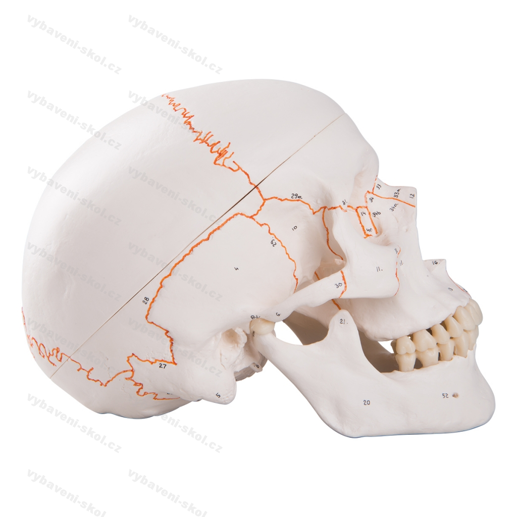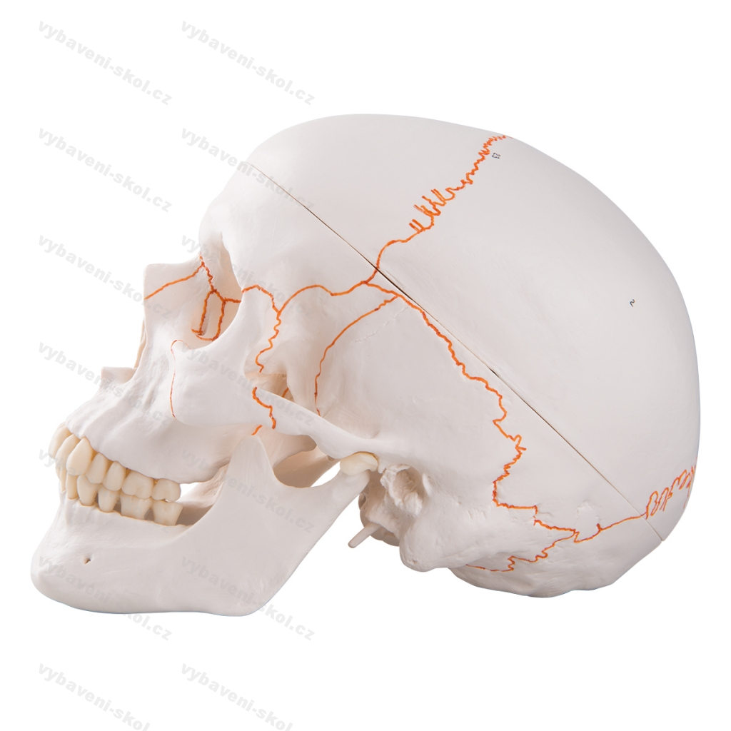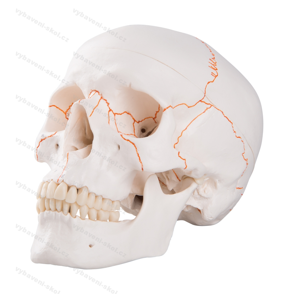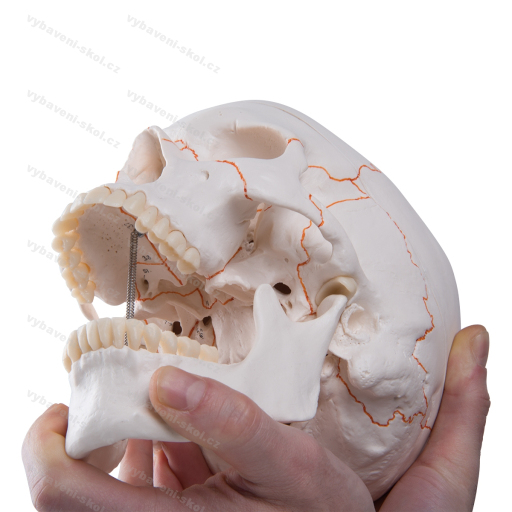 Model lidské lebky se švy ve skutečné velikosti. Rozložitelný na lebeční klenbu, spodinu lebeční a dolní čelist. Číslované části, barevně vyznačené lebeční švy. Kvalita 3B Scientific.