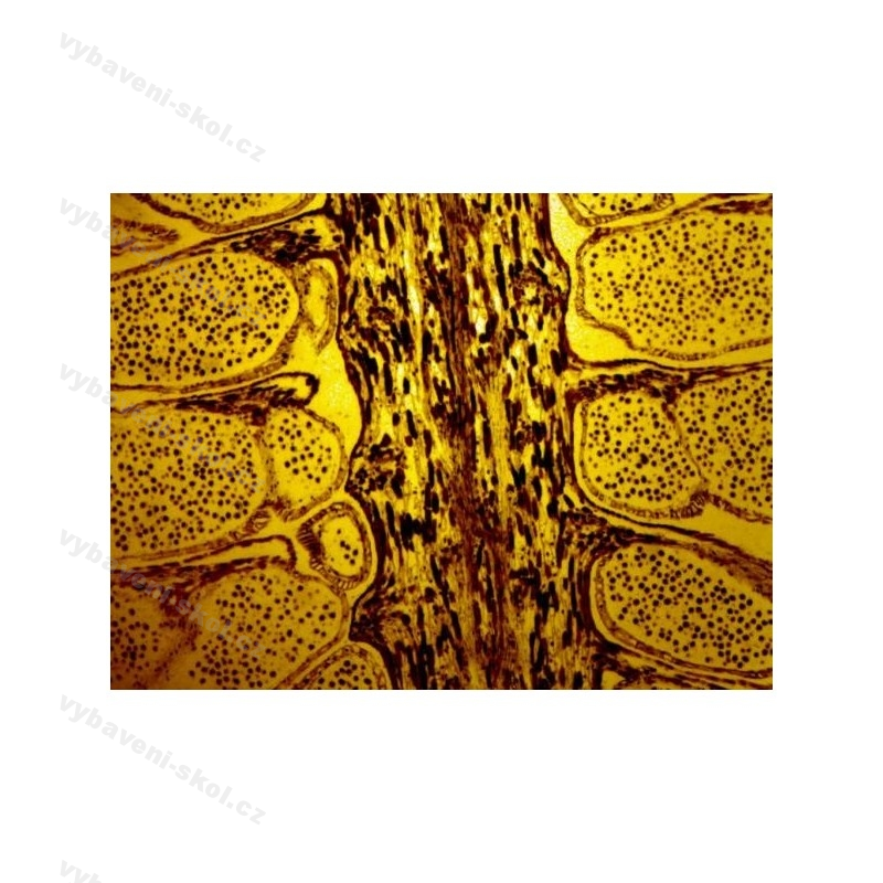 10 preparátů KONUS. Např. krevní nátěr, Epitelové buňky, mozek, plíce, kůže, žaludek, varle, kostní dřeň. V krabičce, náhradní krycí a podložní skla.