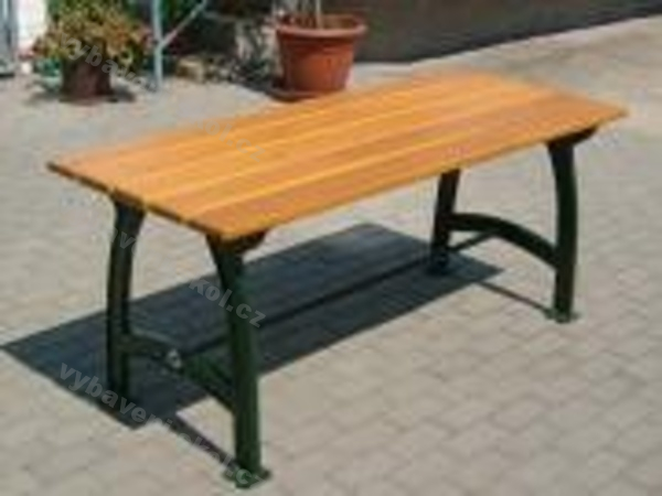 Litinový parkový stůl. Plochu stolu tvoří masívní prkna ošetřená impregnací proti plísním a třemi vrstvami lazury různých dezénu dle naší nabídky. Litinová konstrukce je práškově lakována v barvách RAL z naší nabídky nebo ošetřena žárovým zinkem. Stůl je možno kotvit pomocí šroubů.