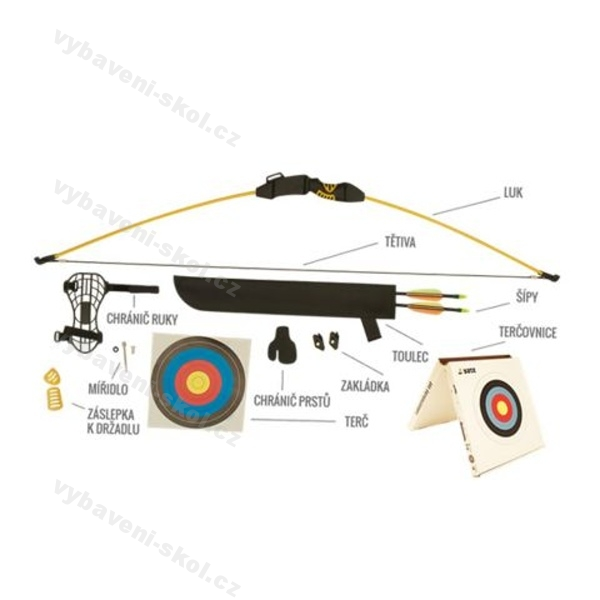 Luk se dvěma šípy, terčovnicí a bohatým příslušenstvím. Set obsahuje: luk, 2 šípy, terč a terčovnici, chránič prstů, chránič ruky toulec na šípy.