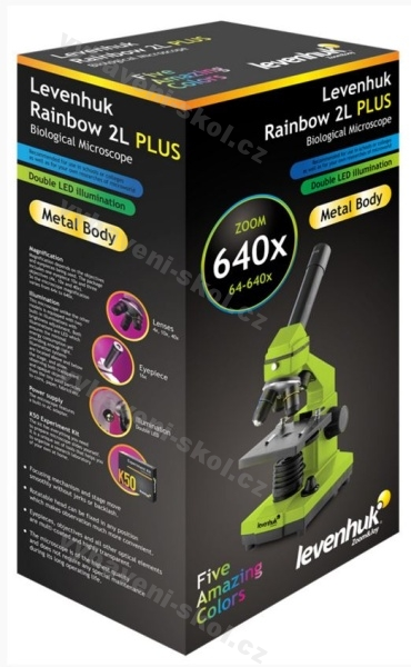 Mikroskop Levenhuk Rainbow 2L PLUS Amethyst\Ametyst. Stylový design a vynikající výkon. Součástí je i experimentální sada. Zvětšení: 64–640x. Rozměr balení: 22,5x14,5x36,5 cm (DxŠxV).