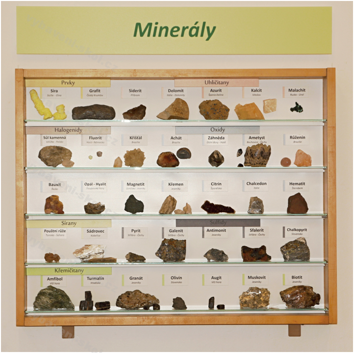 Nástěnná vitrina představující typické zástupce minerálů z našeho území i ze světa. Prvky, sulfidy, halogenidy, oxidy, uhličitany, sírany a křemičitany. 35 kusů.
